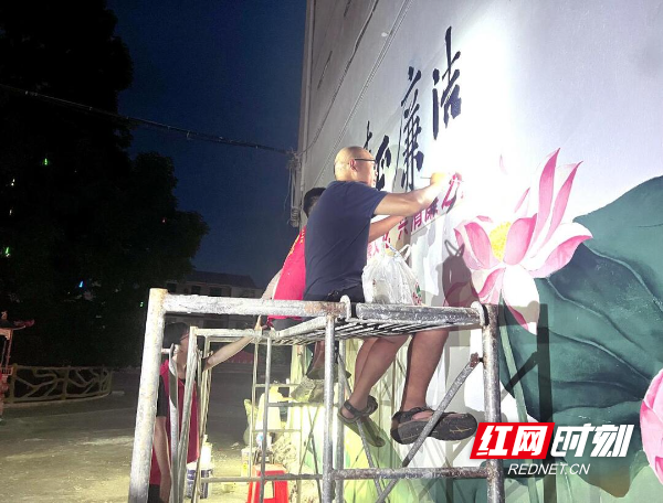 “画得真好,大家来看,这些人物、荷花、蜻蜓都是那么栩栩如生,特别是画的那桶茶油,完全和真的一样,这里以后也是我们富阳村的一张名片啦!”富阳村谢先生和乡亲们围观欣赏时,对程辉纸厂围墙上新画的产业兴旺主题系列图、古树旁的清廉文化图啧啧称赞。