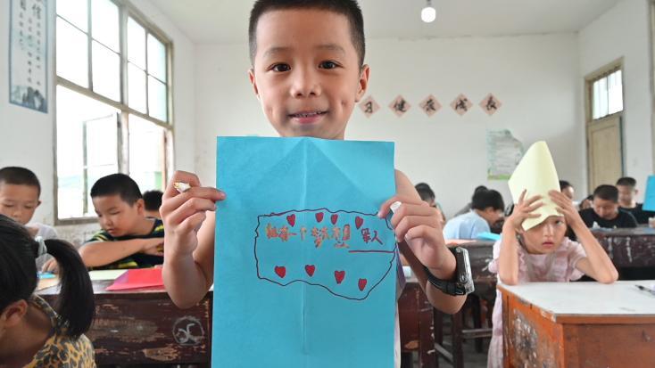 在课堂上,孩子们还将写有他们梦想的彩纸折叠成形态各异的纸飞机。“我有一个梦想,我想当一名军人。”孩子们雀跃地分享着自己的梦想。阳光倾洒而下,他们一起跑到操场,将纸飞机用力投掷出去,一架架五颜六色的纸飞机承载着孩子们的梦想与对未来的憧憬,在蓝天中自由地翱翔。