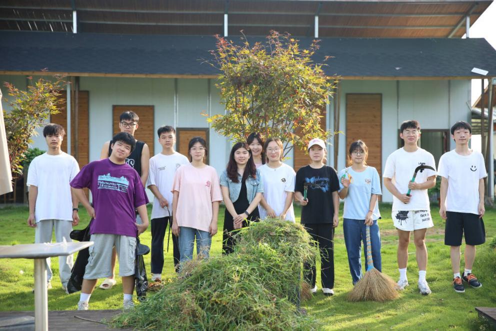 在完成清除草坪上生长的杂草、清理落叶的任务过程中,同学们分工明确,有条不紊。前排先拿镰刀收割,中排用钉耙聚拢堆好,后排负责清扫,在默契的配合中,提高了劳动的效率,磨炼了青年的意志。在完成工作之余,团队成员也帮助基地完成了草地帐篷的收纳整理、留存食品垃圾的清扫工作。同时,团队成员也学会了识别瓜苗等农作物,增长了见识。