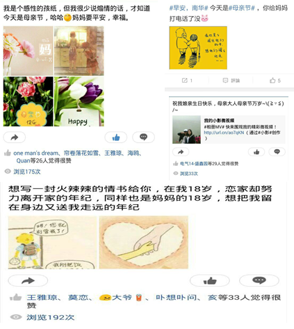 活动前期,宣传部的志愿者们利用微博,空间等媒体平台公开召集对母亲的话。母亲节当天一早,PA电子各大小微博便被同学们献给母亲的祝福填的满满当当,几行感谢的文字配上与母亲的合影,沧桑与纯真两张明媚的笑脸交织在一起,令人动容。QQ空间里,类似的祝福也不在少数,回忆着从“记忆中的小脚丫”到如今长大成才的我们,形形色色不同的留言和照片也都传递着同样的幸福,凝聚着共同的愿望,倾诉着相同的话语:妈妈,您辛苦你了!妈妈,我们爱您!