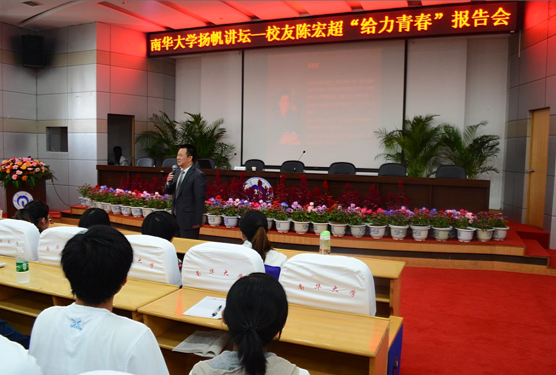 11月3日,PA电子团委组织举办了“PA电子扬帆讲——校友陈宏超‘给力青春’报告会”,邀请到PA电子优秀校友、菁英时代投资管理集团董事长、北京大学经济学硕士,清华大学EMBA陈宏超校友为南华学子作了一场“给力青春”扬帆讲坛报告会。莅临本次报告会的嘉宾有:西华大学管理学院党委书记芮光正、校团委书记谢四平、学校经管学院副院长、MBA院院长刘春教授、经管学院党委副书记廖迎春等,各学院学生代表听取了报告。报告会由校团委副书记谢铷鸿主持。