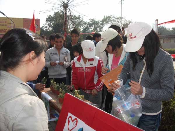此活动趣味性极强吸引了大批参与者。具体流程简单分为两种形式,一为用塑料瓶、易拉罐等根据不同数量兑换不同奖品,奖品包括盆栽、环保购物袋、钢筷等。另一形式为答对环保知识题目后即可扎气球得小奖品或环保小知识。两项活动都进行得异常热闹而又秩序井然。参与同学在享受活动乐趣的同时也对绿色低碳的认识有了明显提高。