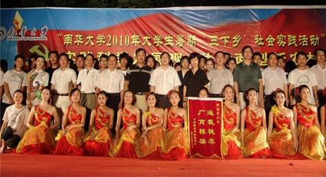 晚会结束后全体服务团队员与领导合影留念,本次晚会可谓是精彩纷呈,歌声唱出了新农村的豪迈;舞蹈跳出了和谐社会的新风貌;相声则用艺术的语言描绘出农村生活的飞速变化。在乡亲们、大学生共欢乐的深厚热烈的气氛中,不仅充分体现了本次“三下乡”活动“践行科学发展观,共建两型新农村”的主题,也给大学生们提供了一个与农民交流,向农民学习,了解农村机会,同时活跃了当地百姓的文化生活,推动了新农村文化发展。(熊洁李新科 方明)