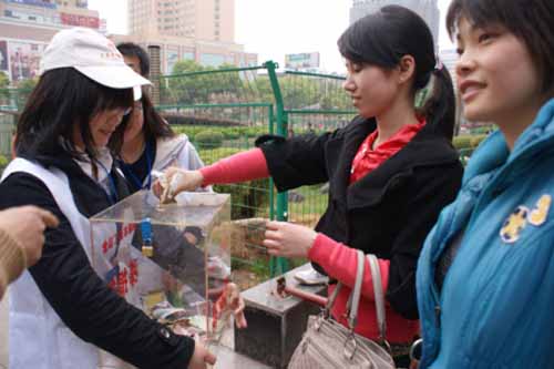 活动第一天,衡阳义工协会便为学生准备好了爱心宣传海报和募捐箱,义工和学生分别分成3个小组,在莲湖广场及附近人员密集的地方组织市民爱心募捐。一位在路旁做手机贴膜生意的小伙子主动喊住志愿者们:“我也捐两元!你们不要嫌我钱少啊!”志愿者朝小伙子微笑答道:“爱心是不能用钱来衡量的,我代表PA电子学子感谢您!”不一会的功夫,很多市民都纷纷慷慨解囊,活动现场温馨活泼,不少素不相识的市民还聚在一起表达了自己对灾区的关注和祝福。