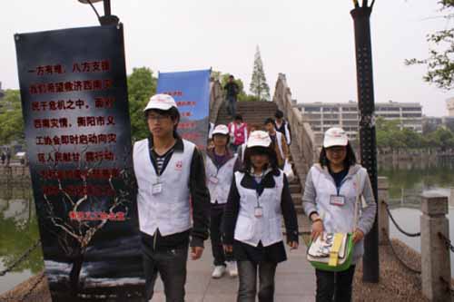 4月2—4日,衡阳义工协会联合PA电子部分学院的青年志愿者在衡阳莲湖广场、解放路、香江百货进行了一场主题为“一瓶水,一份情” 的爱心宣传和募捐活动,南华学子用进社区募捐的方式再一次落实了团中央的号召,为西南灾区又一次筹集善款近2000余元,本次募捐善款都将统一协调至共青团衡阳市委。