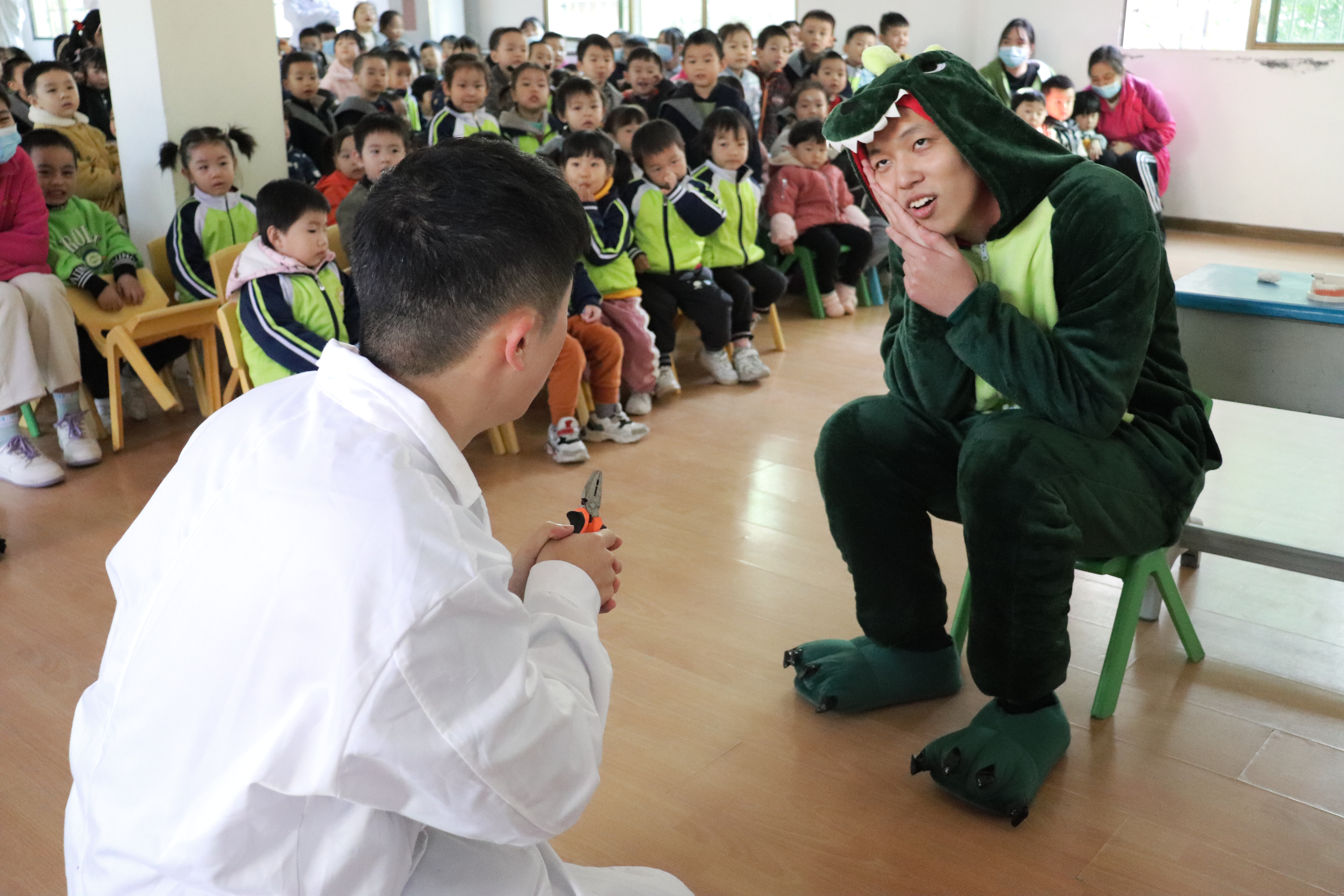 活动中,口腔健康科普协会的同学们首先通过PPT、动画展示和情景剧表演等方式生动形象地向100余名小朋友科普了牙齿的构造,讲解了正确保护牙齿的方法,并强调了保护牙齿的重要性。小朋友们认真听讲,热情高涨,表现得活泼积极,尤其同学们精心排练的情景剧“鳄鱼怕怕”深受小朋友们的喜爱,来自中班的王诗琪小朋友表示:“我一定会保护好牙齿,不要和‘鳄鱼先生’一样长蛀牙”。