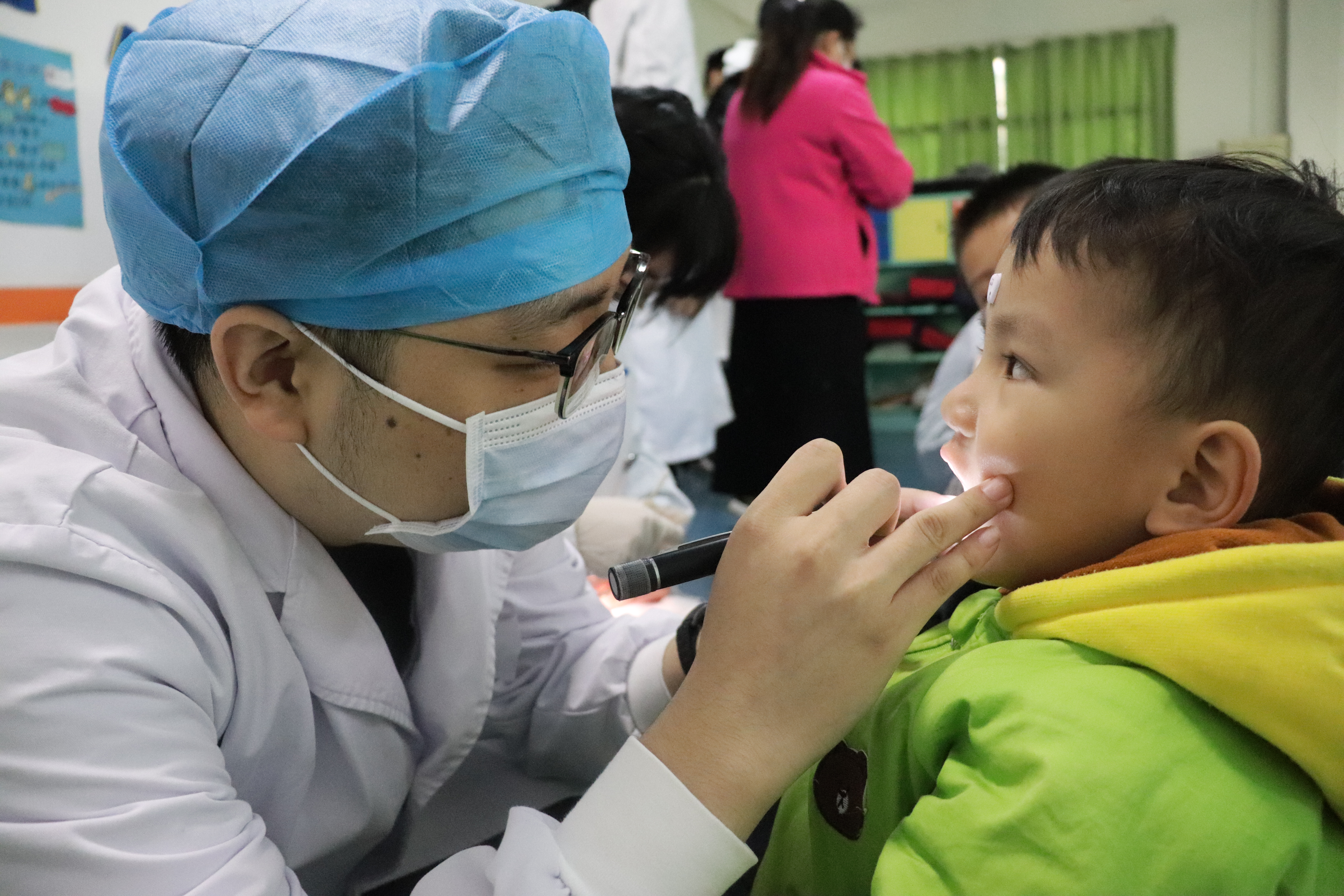 随后,李浩医生利用口腔模型向小朋友们教授了正确的刷牙方式,并带领同学们为小朋友做牙齿健康检查,同时细心地提出了保护建议。
