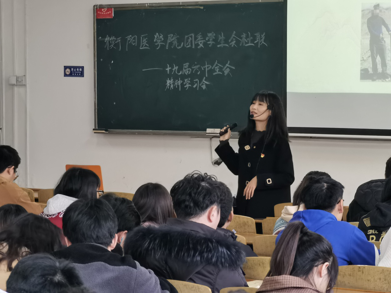 中国共产党第十九届中央委员会第六次全体会议在11月8日于北京召开。为进一步提高衡阳医学院团委、学生会、学社联的思想高度,12月3日中午,衡阳医学院团学干部第十九届六中全会精神学习会在南华楼112教室举行。参加会议的有院党委副书记卢清华、衡阳医学院学工室主任佘雅、2020级年级负责人张茜以及衡阳医学院团委学生会学社联各年年级各部门干部。本次会议由团委书记李杨主持。
