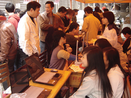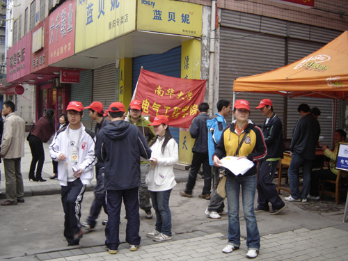 上午9点,活动正式开始,有的小区居民拿着自家的故障电器来请志愿者帮忙维修;不少老年人过来测量血压,听志愿者耐心地讲解健康保健知识;也有的家长过来咨询有关高考方面的信息。一部分志愿者在路边分发有关预防艾滋病方面的宣传小册子。活动场面非常火热,拿着电吹风等着维修的许爷爷说:“这是为人民服务啊!我的这个吹风机维修得花好几十块钱,扔了又觉得可惜了,你们给我们修好了的话,还可以减少浪费呢!希望你们以后能经常来......”