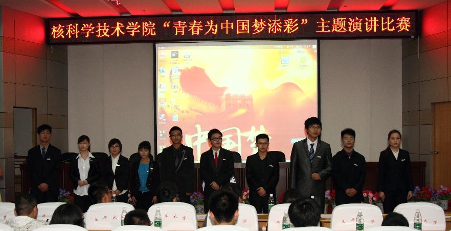 为深入学习贯彻落实了两会精神,进一步弘扬民族精神、表达南华学子爱国之心、传递正能量,促进我校学风、校风建设,丰富校园文化生活。4月15日晚7:30,由核科学技术学院组织部主办的“青春为中国梦添彩”演讲比赛在我校图书馆报告厅隆重举行。核科学技术学院党委副书记刘和福、学工室负责人陈彦武、团委书记蒋林、辅导员文莉和校学生会副主席关晋涛莅临本次比赛并担任评委。