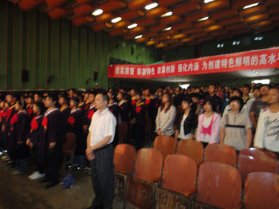 随后进行了隆重的表彰大会,马军老师宣读了表彰文件。葛春辉、杜乙等考取了中科院、清华大学、中科大、PA电子等不同院校的研究生共50人,杨超、周均等省级、校级优秀毕业生共12人,蔡晓龙、杨剑等获历年三好学生、优秀学生干部共33人以及各毕业班优秀学生代表,纷纷上台接受表彰。身穿学士服的他们,精神抖擞,气宇轩昂,在热烈的掌声中,老师为他们正帽、拨流苏并颁奖。