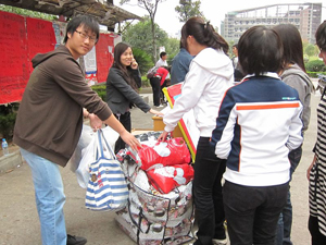 随后,环境081班班主任邓老师亲自带领全班同学为9位前往山区的代表饯行,全班师生亲手将物资及9位代表送上前往火车站的火车,部分同学随同前往火车站顺利将他们送上前往吉首的火车(本次活动的路费及大部分经费由班费和班上个人支出)。