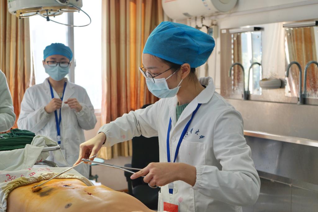 2017级临床医学、麻醉学、医学影像学、口腔医学等专业,共28个班级参加了此次比赛,比赛内容包括病史采集、心电图判读、体格检查、缝合打结等临床基本技能,临床技能中心王汉群、李熠、沈元琼、黄靓、朱梦霞等老师担任评委。
