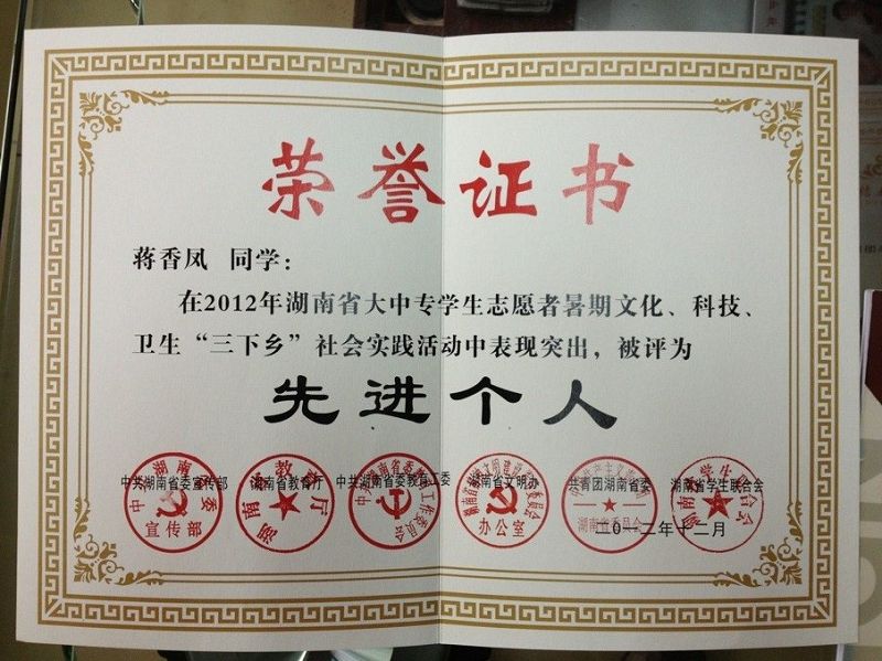 蒋香凤在2012年湖南省大中专学生志愿者暑期文化、科技、卫生“三下乡”社会实践活动中被评为先进个人
