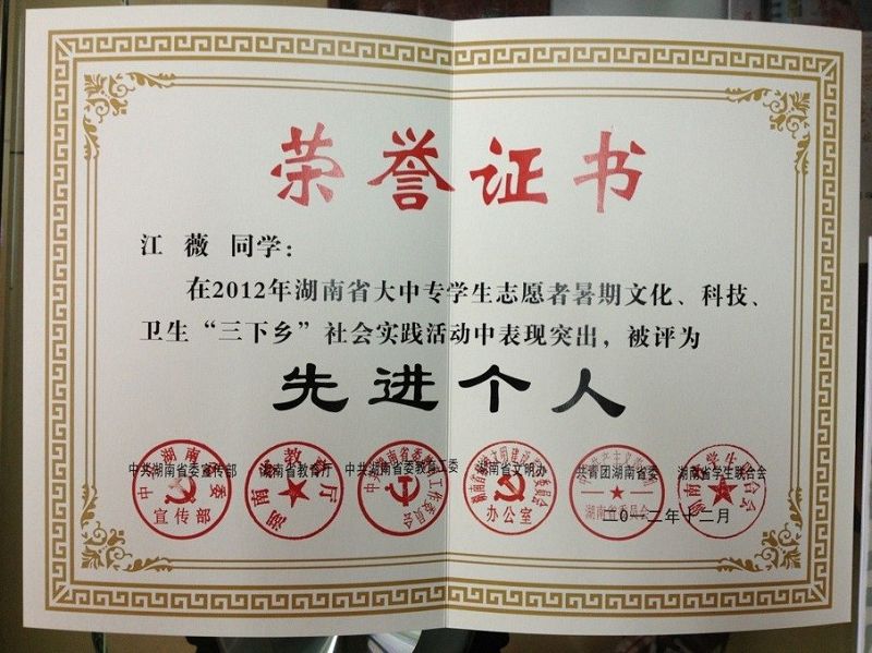 江薇同学在2012年湖南省大中专学生志愿者暑期文化、科技、卫生“三下乡”社会实践活动中被评为先进个人