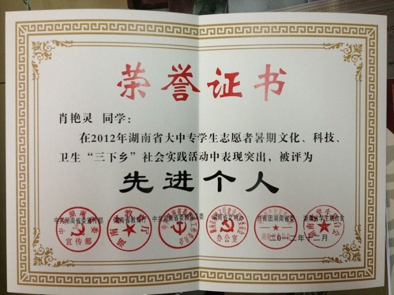肖艳灵同学在2012年湖南省大中专学生志愿者暑期文化、科技、卫生“三下乡”社会实践活动中被评为先进个人