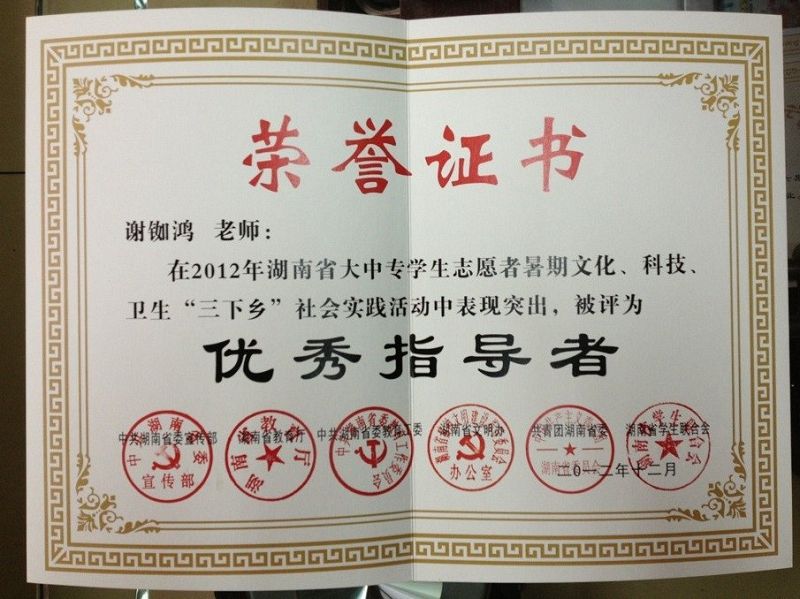 谢铷鸿老师在2012年湖南省大中专学生志愿者暑期文化、科技、卫生“三下乡”社会实践活动中被评为优秀指导者