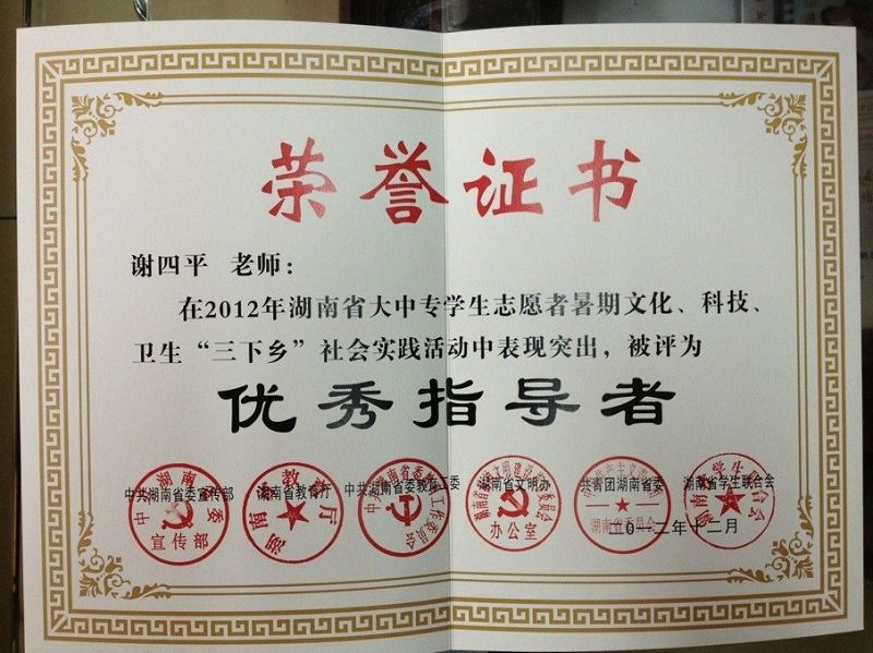 谢四平老师在2012年湖南省大中专学生志愿者暑期文化、科技、卫生“三下乡”社会实践活动中被评为优秀指导者