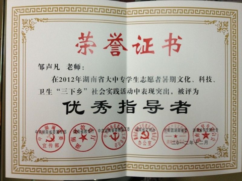 邹声凡老师荣获2012年湖南省大中专学生志愿者暑期文化、科技、卫生“三下乡”社会实践活动优秀指导者称号
