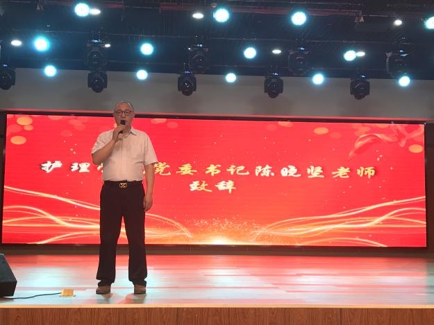 晚会伊始,在热烈的开场舞后,护理学院党委书记陈晓坚致辞。他以饱满的热情向所有出席晚会的领导、嘉宾、老师、同学致以亲切的问候。他提到,今年恰逢建党100周年和建院36周年,护理学院高举党的旗帜,近年来取得了许多优异的成绩,如2018年通过教育部护理学专业认证,2019年获首批国家级一流本科专业建设点,2020年获湖南省智慧优护工程技术中心等。他特别提到,护理学院的同学们在各方面留下的闪光足迹,尤其是2017级四名同学获第十届中国大学生医学技术技能大赛护理学专业赛道全国总决赛金奖,他们以优异的成绩为学院争光夺彩。他代表学院对即将毕业离校的同学们表示衷心的感谢和热烈的祝贺,希望同学们铭记校训和院训,勿忘初心,继续开创精彩的人生道路,取得学业上的进步和事业上的成功。