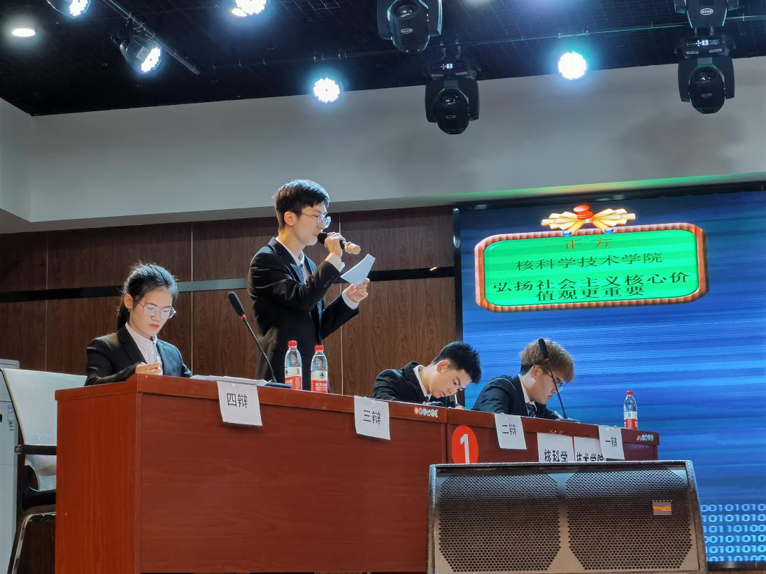 作为正方的核技术学院辩论队开篇立论,言简意赅,让同学们迅速的进入辩论状态。他们认为践行社会主义核心价值观的最终目的是在整个社会弘扬社会主义核心价值观,正是因为对奉献精神、拼搏精神等民族精神的弘扬,人们才知道了许多先进事迹。而这些事迹反过来又影响了很多人,感动了很多人,从而带动更多的人去行动。践行社会主义核心价值观不仅是个人的事情还是社会的事情,人也是社会的一部分,而一个人的时间是有限的,如果仅靠自己默默地去做只能影响到周围的少数人,而如果动用社会的力量,高调的去弘扬社会主义核心价值观,则能利用有限的时间影响到更多的人。他们在表述自己观点的同时也引用了多个例子的同时运用多种论据支撑自己的观点,场面十分生动精彩。