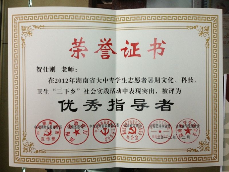 贺仕刚老师荣获2012年湖南省大中专学生志愿者暑期文化、科技、卫生“三下乡”社会实践活动优秀指导者