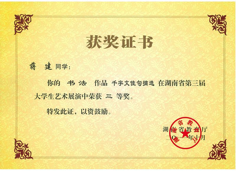 蒋建同学在湖南省第三届大学生艺术展演中荣获三等奖